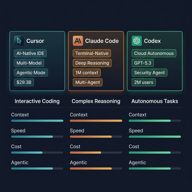 Cursor · Claude Code · Codex — three different AI dev tool layers, three different use cases