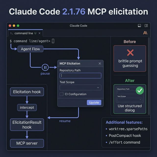 Claude Code 2.1.76 adds MCP elicitation — MCP servers can now request structured input mid-task via an interactive dialog. Analysis of new features: Elicitation hooks, worktree.sparsePaths, PostCompact hook, /effort command, and how they make agent workflows less brittle and safer.