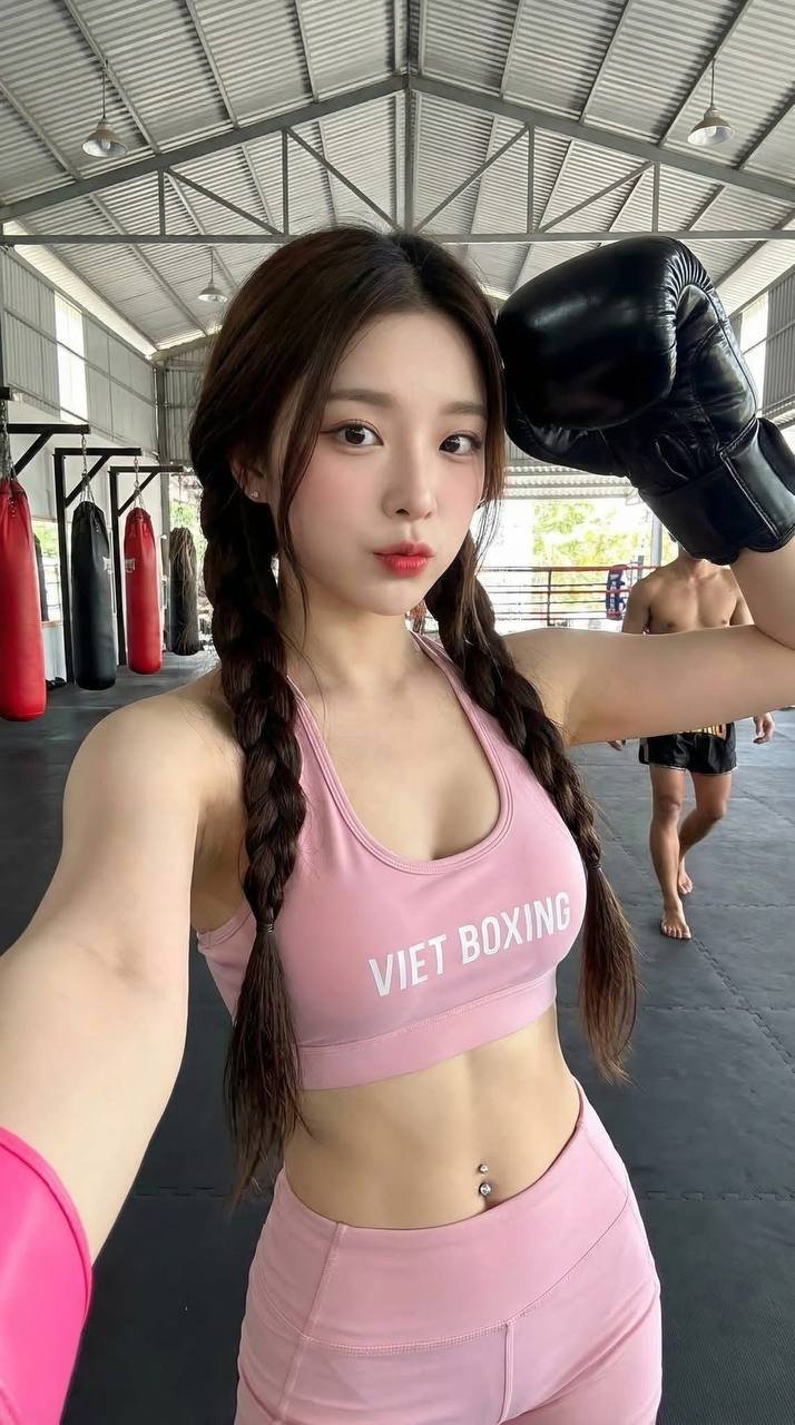 Outfit: Wearing a pastel pink workout outfit. The top is a deep U-neck sports bra with the English words "VIET BOXING" printed horizontally across the chest in white. The bottoms are high-waisted, form-fitting shorts, revealing a flat waist and two sparkling crystal belly button piercings.