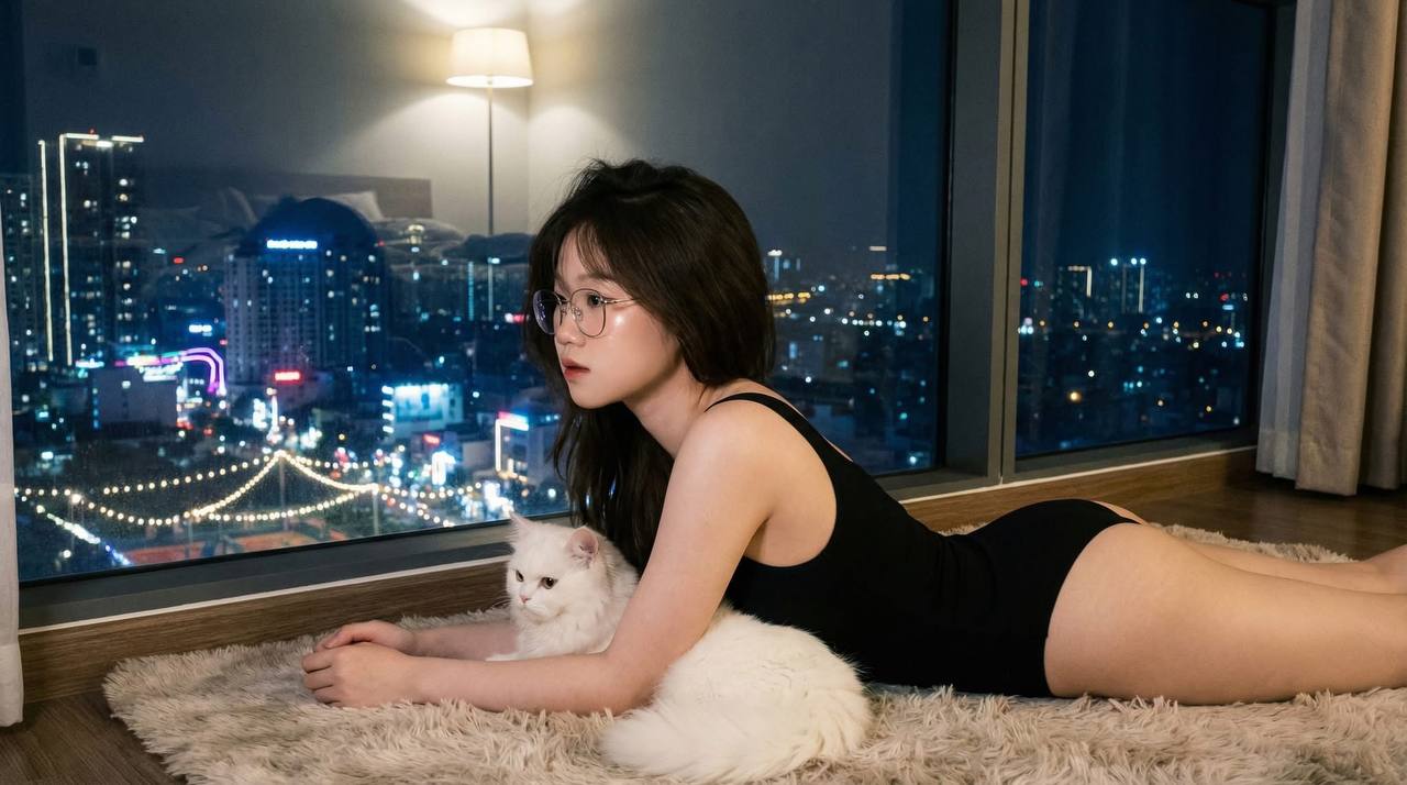 Pose: lying face down on a soft rug/carpet near the floor-to-ceiling window, propped up on elbows, head and shoulders turned outward gazing at the city lights below. A beautiful pure white Persian cat lies beside her, nestled comfortably against her side, both facing the window. This pose accentuates her figure.