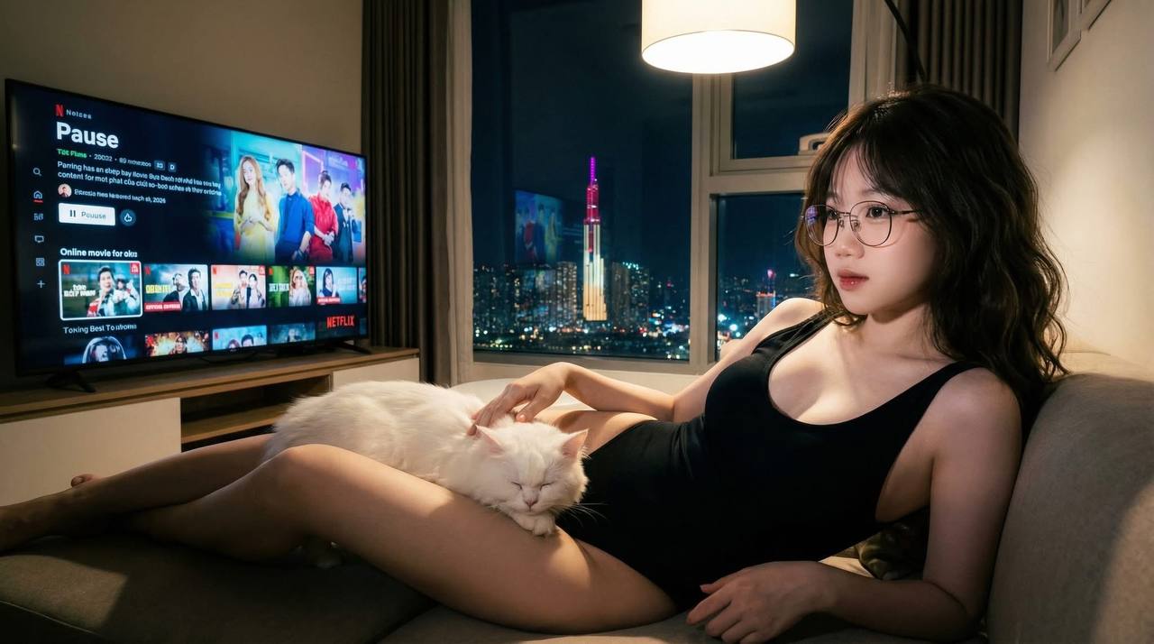 Location: luxury bedroom at Landmark 81 apartment. Large flat-screen TV on the wall showing a colorful movie streaming interface (Netflix-style). Large floor-to-ceiling window with city night lights visible.