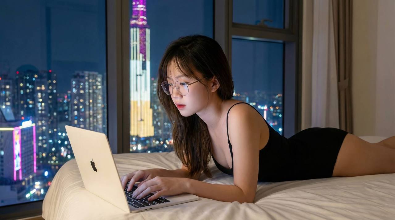 Pose: lying face down on the bed near the floor-to-ceiling window, propped up on elbows, hands resting naturally on a white MacBook keyboard. Head turned slightly outward, gazing at city lights at night through the glass. Pose accentuates her figure.