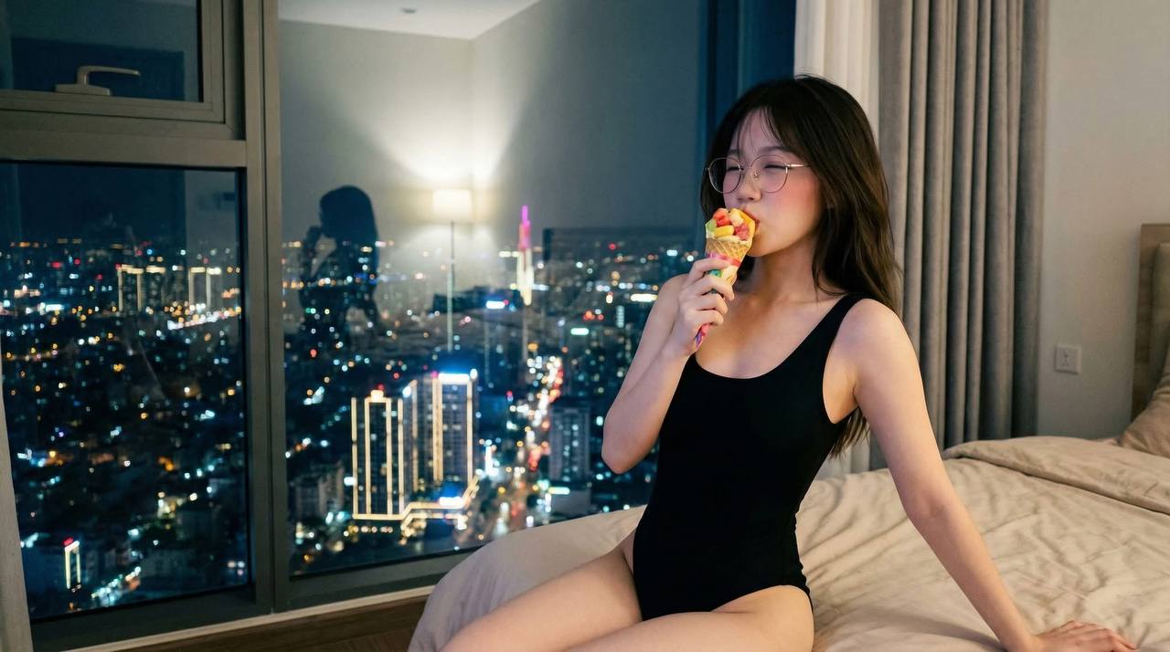 Pose: sitting on the bed near the large floor-to-ceiling window. One hand holding a fruit ice cream cone near her lips — mouth slightly open as if about to lick, head tilted slightly looking sideways out the window. Other hand relaxed behind her. One eye slightly squinting naturally. Shoulder turned outward, pose accentuates her figure — sensual and natural.