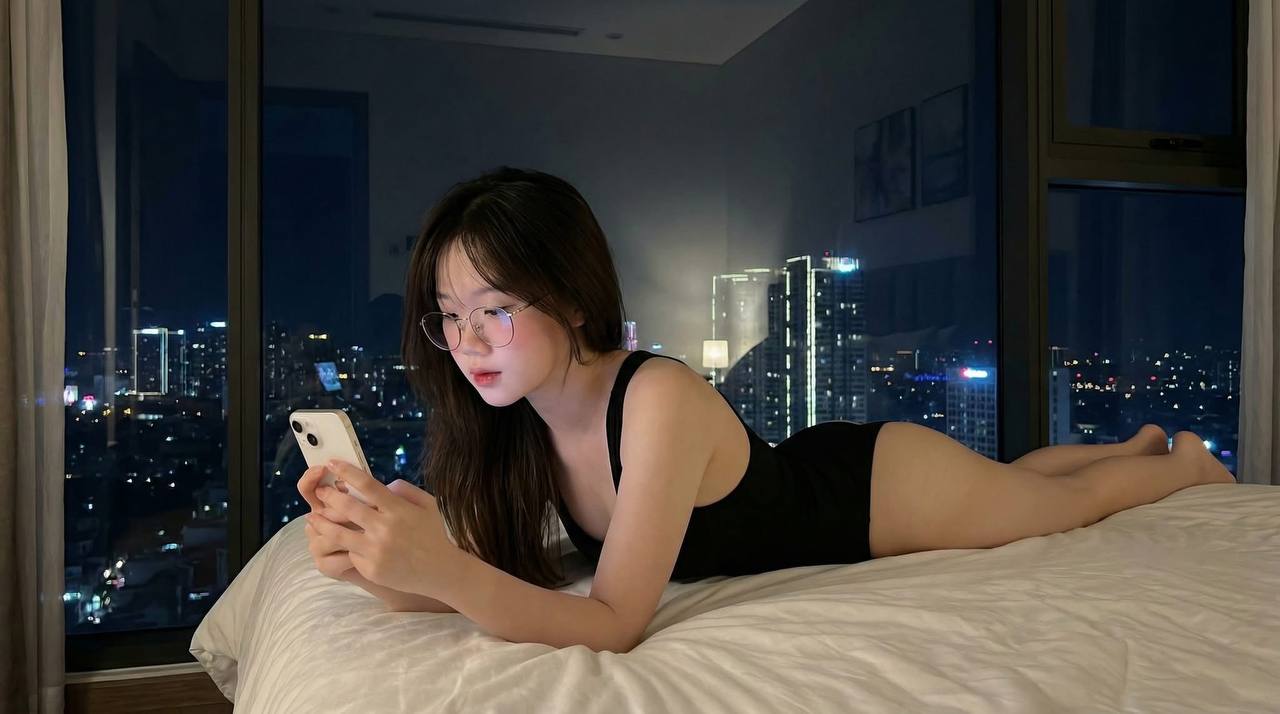 Lighting: soft overhead room light on her face and body, subtle amber reflection off the phone screen. Midnight city neon through glass. Warm ambient room light. Vintage film grain effect.