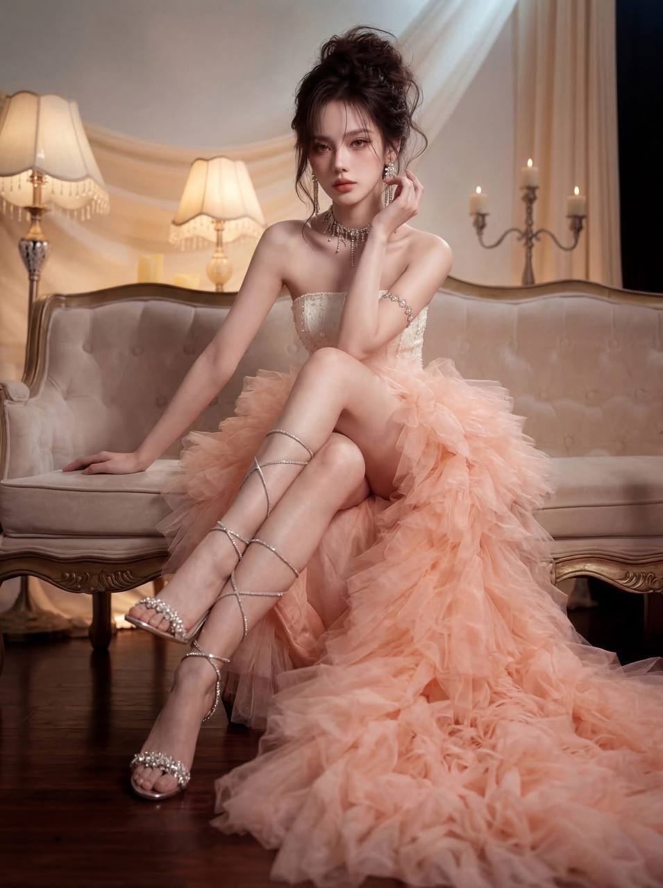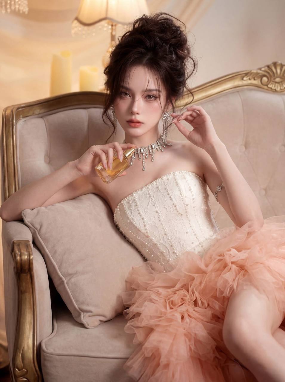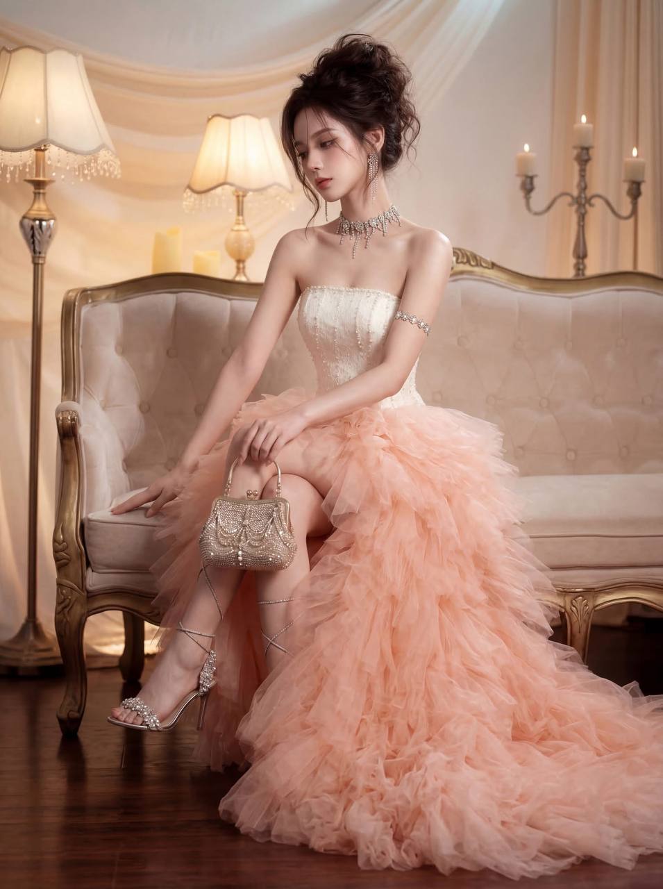 Photorealistic 3/4-body portrait of the same young East Asian woman, seated gracefully on an ornate cream French sofa with gold-painted carved frame. Same character: dark brown messy bun updo, glamorous warm-toned makeup, peachy blush, nude coral lips. Same cream pearl-embroidered corset bodice + voluminous layered peach/coral tulle ruffled gown. Same crystal rhinestone choker, drop earrings, silver crystal armlet.