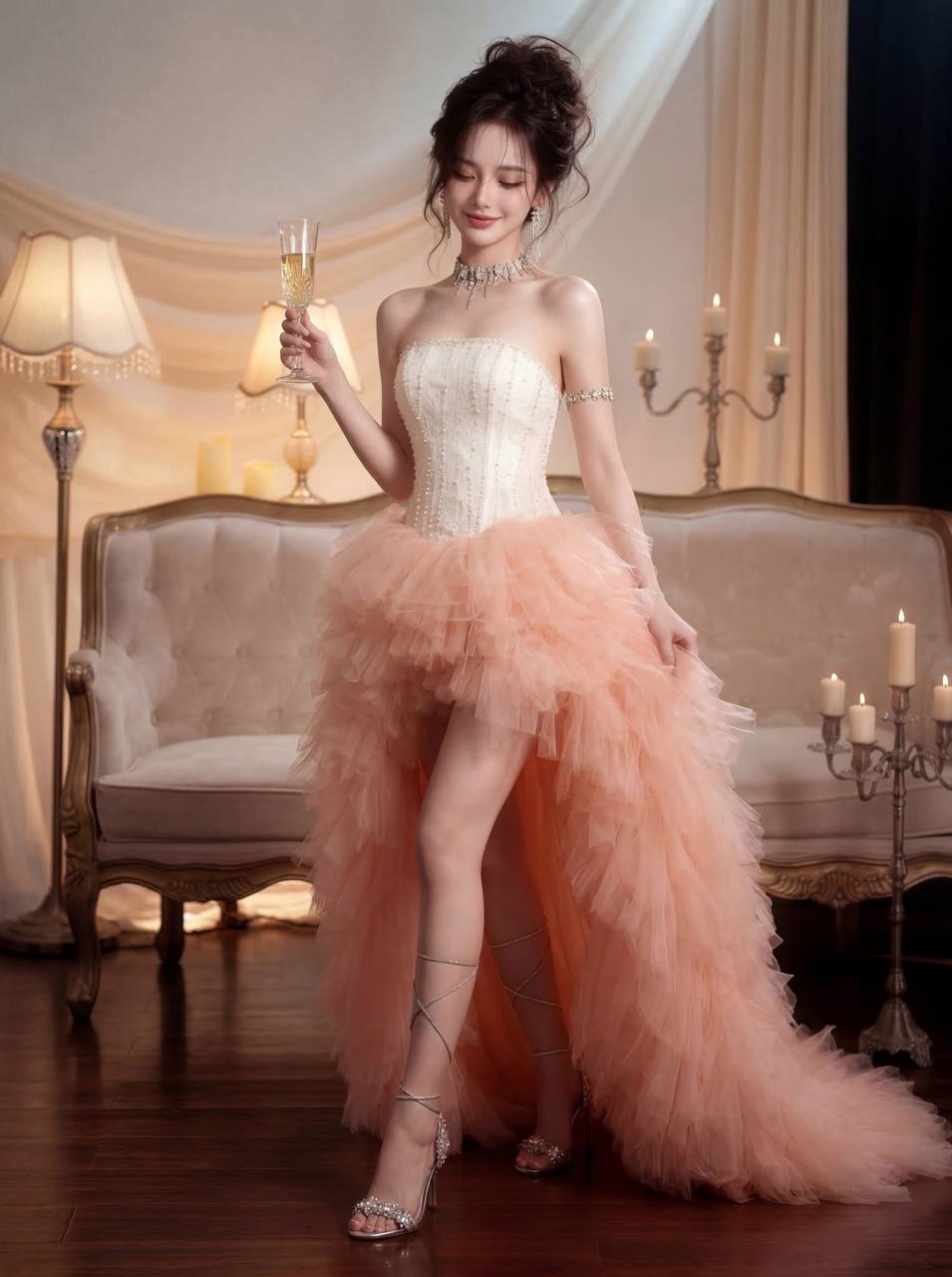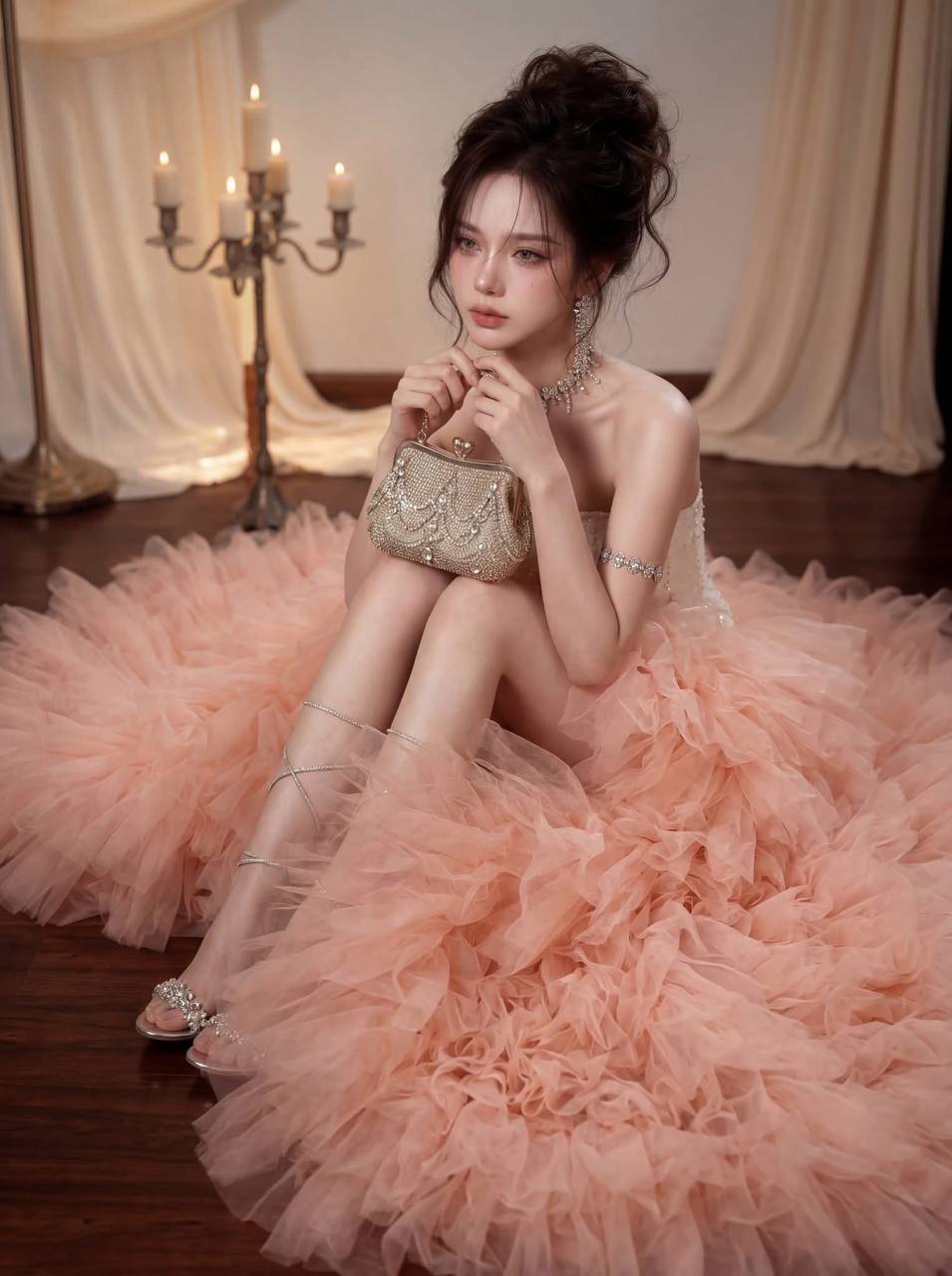Muse in Bloom — 5 AI Prompts for Luxury Glamour Photography: Peach Tulle Gown & Candlelight