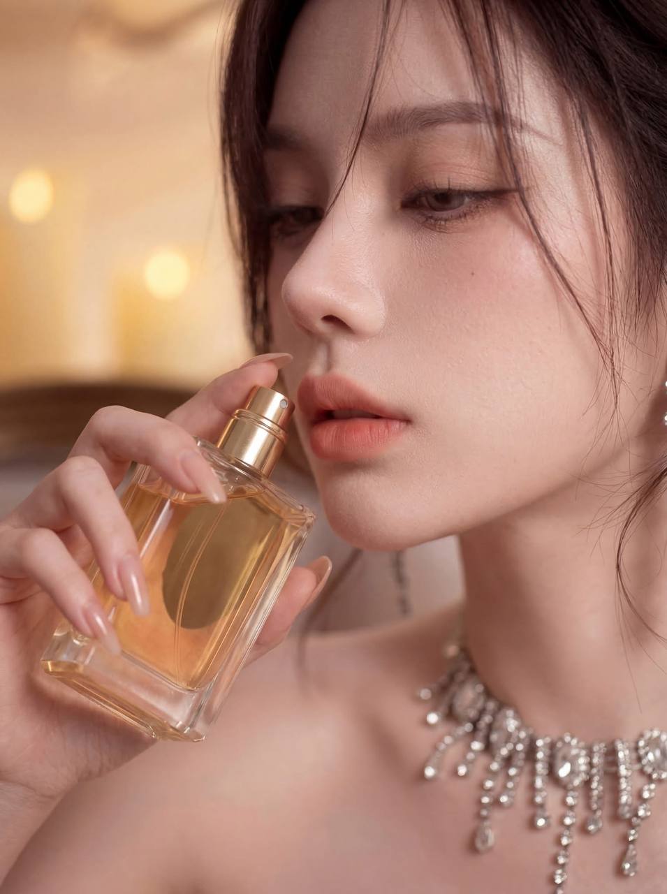 Sharp focus on face, eyes, and necklace. Perfume mist slightly soft-focus to create dreamy haze. 85mm f/1.8, 8K, maximum detail on skin texture, jewelry, and mist particles. Moody glamour photography style, editorial quality, warm amber accent lighting.