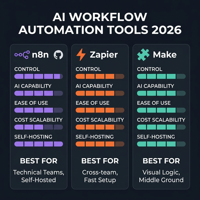 n8n · Zapier · Make — ba lớp AI workflow automation, ba nhóm use case khác nhau