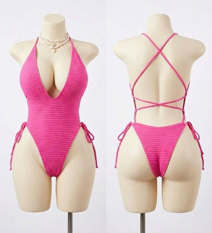 Ảnh outfit gốc — hot pink ribbed halter one-piece, lace-up sides, criss-cross back