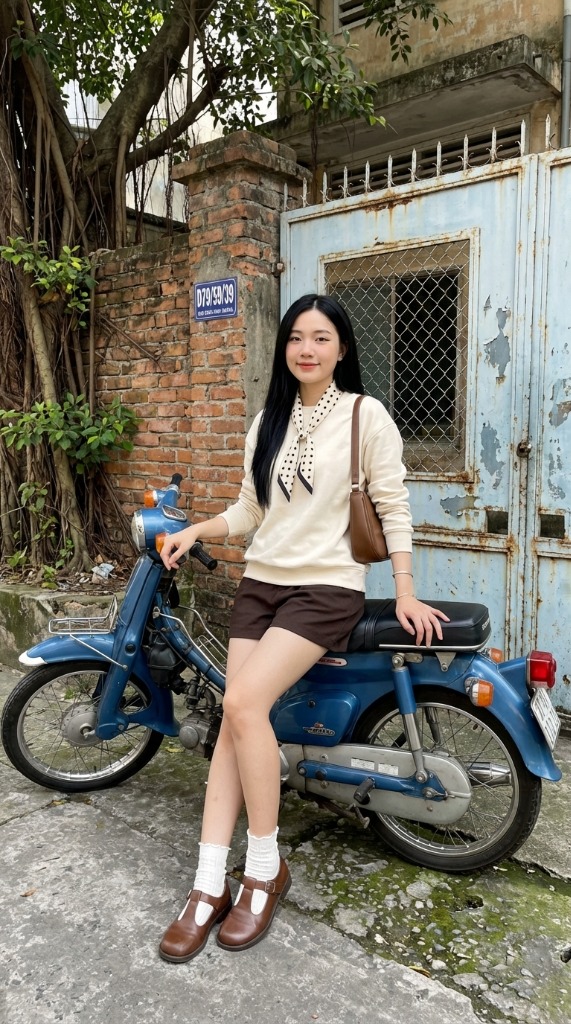 Hãy để ý kỹ kết quả: khuôn mặt giống hệt Ảnh 1, bộ trang phục (áo sweater trắng, quần short nâu, khăn polka-dot, túi da nâu, tất trắng, giày Mary Jane nâu) được chuyển từ flatlay sang đúng vóc dáng người thật, và tư thế ngồi trên xe máy cổ điển được sao chép từ Ảnh 3. Studio background trung tính thay thế background street gốc.