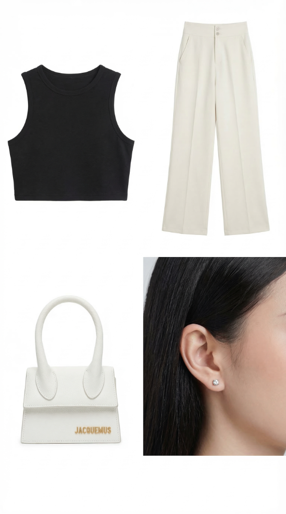 Khó có thể tin là chiếc túi xách Jacquemus, cái áo crop-top đen, quần ống suông và hoa tai... lại được ráp vừa vặn hoàn hảo lên form dáng sẵn có của người mẫu mà nét mặt, góc pose và kiểu ánh sáng của căn phòng vẫn nguyên vẹn.
