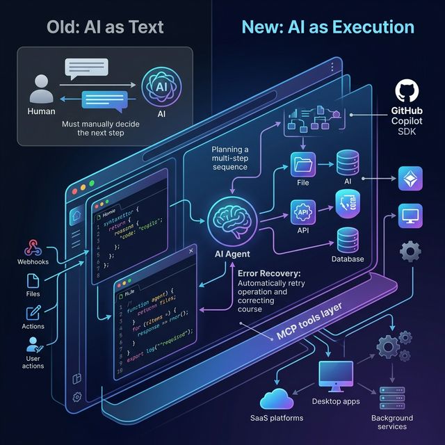 With the Copilot SDK approach, execution becomes an application-layer capability: the system listens for an event (file change, deployment trigger, user action) → invokes AI programmatically → the planning and execution loop runs inside your product.