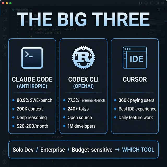 | Solo dev / startup | Cursor | Codex CLI | Copilot ($10/month everywhere) |