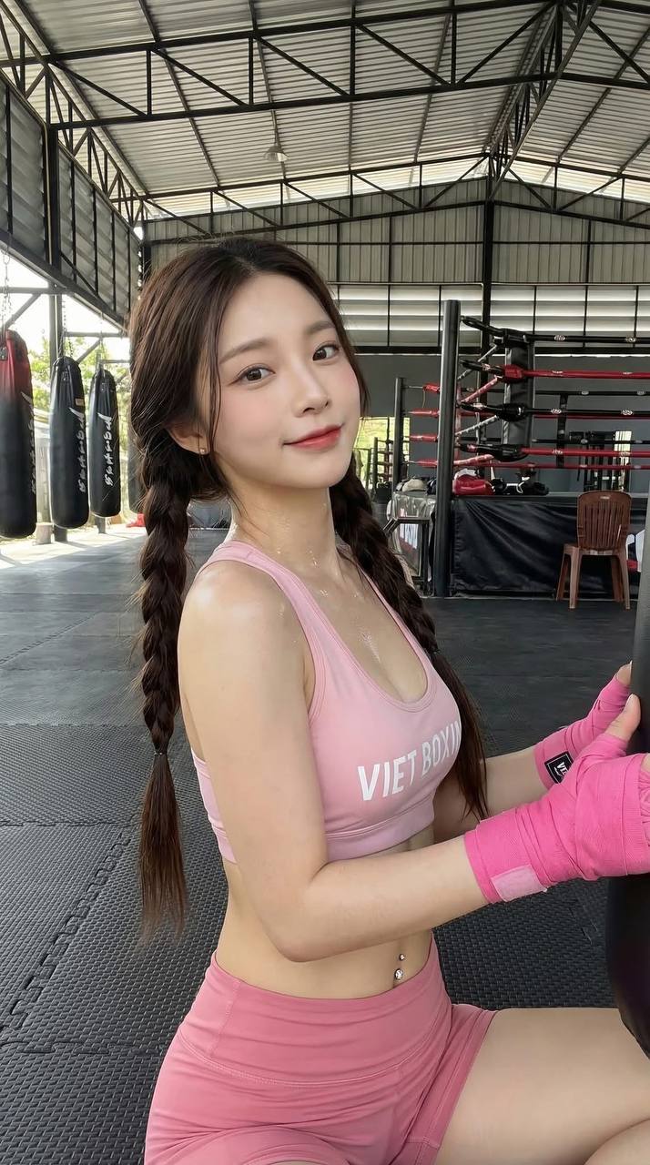 Outfit: Wearing a pastel pink workout outfit. The top is a deep U-neck sports bra with the English words "VIET BOXING" printed horizontally across the chest in white. The bottoms are high-waisted, form-fitting shorts, revealing a flat waist and two sparkling crystal belly button piercings.